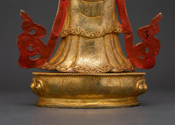 Manjushri, the embodiment of knowledge, is pictured with his characteristic sword of wisdom, which represents the cutting through of ignorance to unveil ultimate truth. His composed demeanor and beautiful stance indicate his extensive knowledge and duty as a mentor for people seeking enlightenment. The meticulous craftsmanship, from the folds of his robes to the calm countenance, demonstrates the artists' passion to bringing this hallowed figure to life.