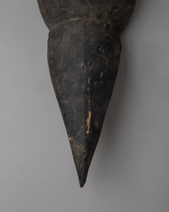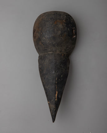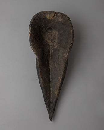 The Wooden Bird Mask, at 34cm tall, captivates with its rich detailing and symbolic meaning. This historic sculpture, made of wood and shaped like a bird, has a fascinating history that dates back to the Himalayas.