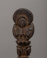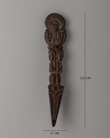 This Wooden Dorje Phurba Dagger is a precious ritual tool with profound roots in Himalayan and Tantric spiritual practices. The phurba, which is meticulously hand-carved from wood, is used during ceremonies to ground negative energy, eliminate obstructions, and preserve spiritual areas. Its tri-bladed design, adorned with symbolic deities and imagery, symbolizes a division of ignorance, desire, and aversion—essential for transformation and spiritual release.