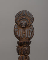 This lightweight yet powerful relic, 29 cm tall and 6 cm wide, exemplifies the old workmanship of Himalayan artisans. The upper half has detailed carvings of wrathful faces and deity forms, and the lower blade is sharpened for symbolic rather than functional purposes, acting as a spiritual weapon rather than a physical one. This phurba, which is frequently connected with Vajrakilaya and other wrathful protector deities, is excellent for altars, meditation areas, or as spiritual presents for Vajrayana and shamanic practitioners.