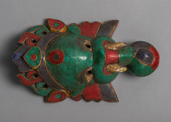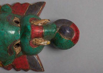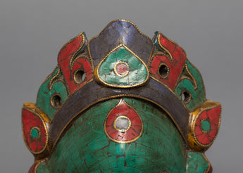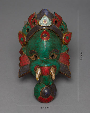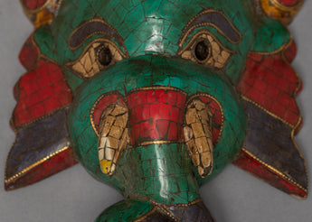 The Ganesh mask is made of wood with gemstones inlaid is an ornate decorative item inspired by the Hindu god, Ganesh. The mask is made of high-quality materials and features lovely patterns and designs, as well as sparkling gemstone embellishments. This mask is an excellent way to honor this deity and invite his blessings into your home. It can be displayed on a stand or a wall For Decorative purposes.