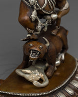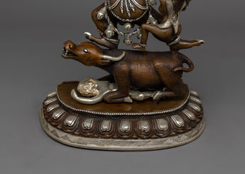 The wrathful deity Dharmaraja Yama statue is a powerful and intricate representation of transformation and protection, standing at 14.8 inches (37.5 cm) in height and 12 inches (30.5 cm) in base width. Crafted from an oxidized copper body, the statue is beautifully silver-plated, giving it a refined and mystical appearance. The detailed design captures Yamantaka’s fierce, protective nature, symbolizing the conquest of inner obstacles and the victory over death.