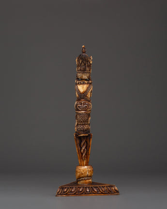 This Vajrakila Phurba is a spiritual relic and a potent meditation instrument utilized in Vajrayana Buddhism to balance and harmonize energies. With its yak bone material and traditional Tibetan craftsmanship, this sculpture is a rare and significant addition to any altar, meditation room, or spiritual collection. Use this ritual dagger for meditation, ceremonies, or as a protective symbol in your holy area. The wrathful deity represents courage and inner power, supporting practitioners on their spiritual journey while protecting them from bad influences. This Phurba is ideal for individuals seeking spiritual growth and represents the profound Tibetan Buddhist philosophy.