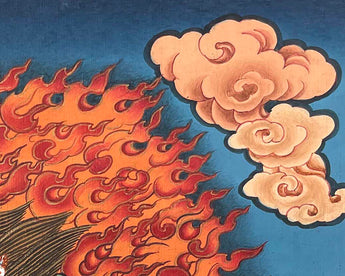 Vajrapani's fierce stare and unwavering bravery serve as a motivational reminder of the inner strength and bravery required to eradicate ignorance from our lives. A balanced image that conveys the duality of wrath and compassion is produced by the contrast between Vajrapani's dynamic, flaming form and the tranquil landscape background, complete with mountains and clouds. The thangka's symbolic richness is enhanced by every little detail, from the flowing vitality of flames to the glittering ornaments and sacred stones. This Thangka is perfect for meditation areas, shrines, or as a potent protective artwork that brings divine strength and clarity into your sacred space.