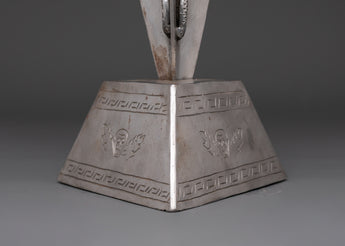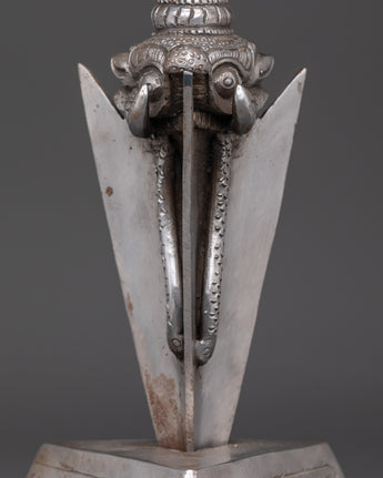 Experience the powerful energy of this Wrathful God Ritual Tool phurba, which measures 41cm in height and 17.5cm in width. Crafted from iron and weighing 3.01kg, this Tibetan ritual blade is intended to channel the ferocious protective power of wrathful deities. Traditionally utilized in tantric ceremonies, the phurba acts as a spiritual protector, transforming negative energies and barriers into beneficial powers. This special relic connects you to old Himalayan spiritual traditions, providing a strong presence for meditation and holy rituals.