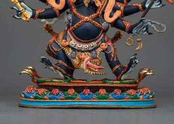 This Hayagriva Statue, which stands 13.6 inches tall and has a base width of 10.8 inches, is an outstanding example of Tibetan artistry. This sacred item, weighing 4.14 kg, is skillfully crafted from copper and embellished with 24K gold gilding as well as vibrant gold and acrylic paintings that showcase Hayagriva's wrathful energy.