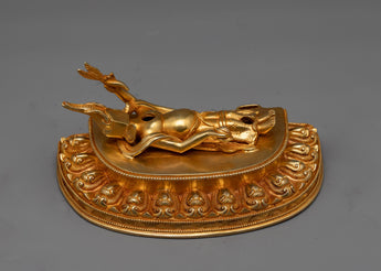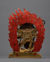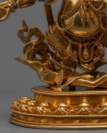 Invoke the might of the Wrathful Six-Armed Mahakala, a symbol of protection and strength. This stunning figure, standing 12.2 inches tall and weighing 3.75 kg, commands attention with its excellent craftsmanship. It exudes strength and grandeur since it is made of 24K gold-gilded copper and is embellished with elaborate gold and acrylic paintings. Allow the powerful force of Mahakala to protect your holy area and keep out bad vibes and roadblocks while you progress spiritually. Feel a sensation of empowerment and fearlessness awaken inside you as you consider his furious expression and six arms holding symbolic instruments. Whether on exhibit in your house, a place of meditation, or a shrine