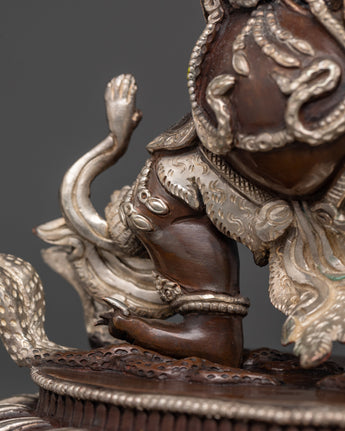 The Wrathful Trakpo Sumtril statue is a beautifully detailed depiction of one of Tibetan Buddhism's most powerful and aggressive deities. This magnificent statue is made of copper, plated in silver, and decorated with bright acrylic paints. This ferocious figure represents protection, strength, and the ardent compassion required to overcome challenges on the spiritual path.