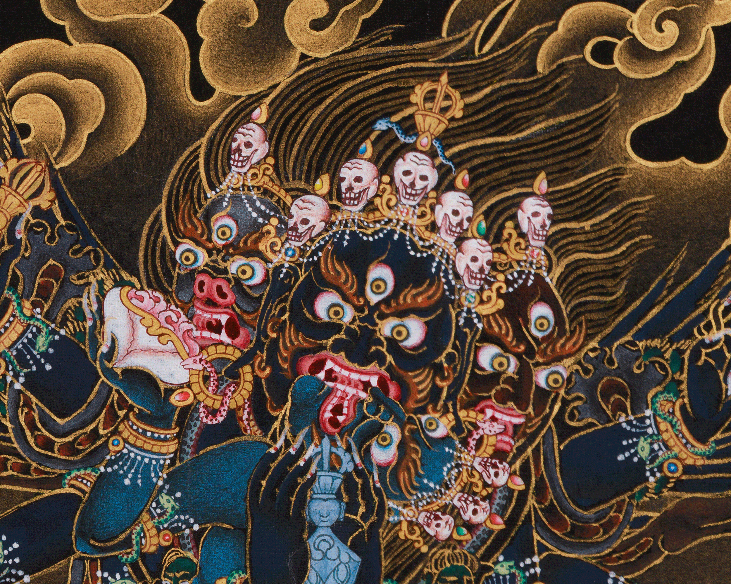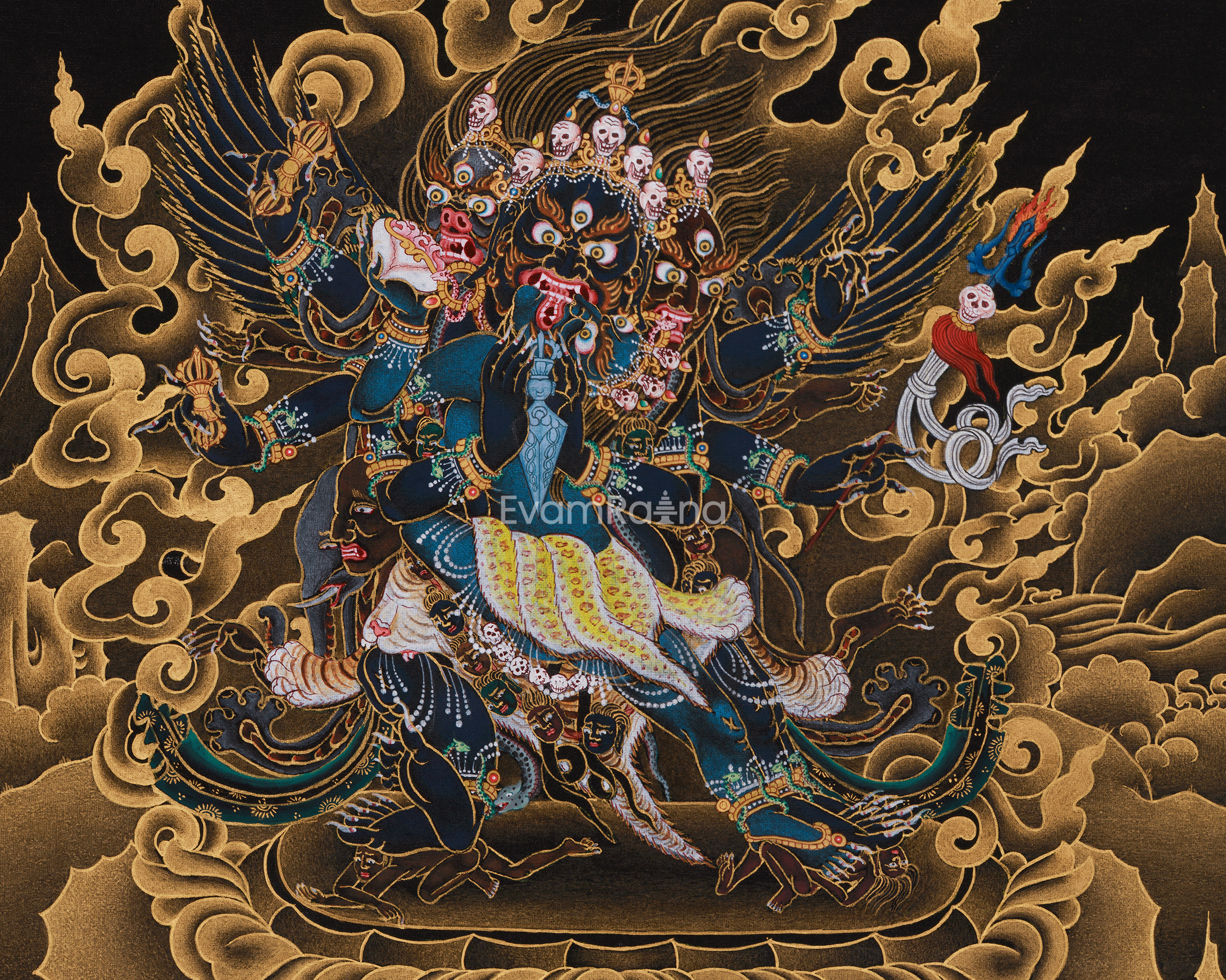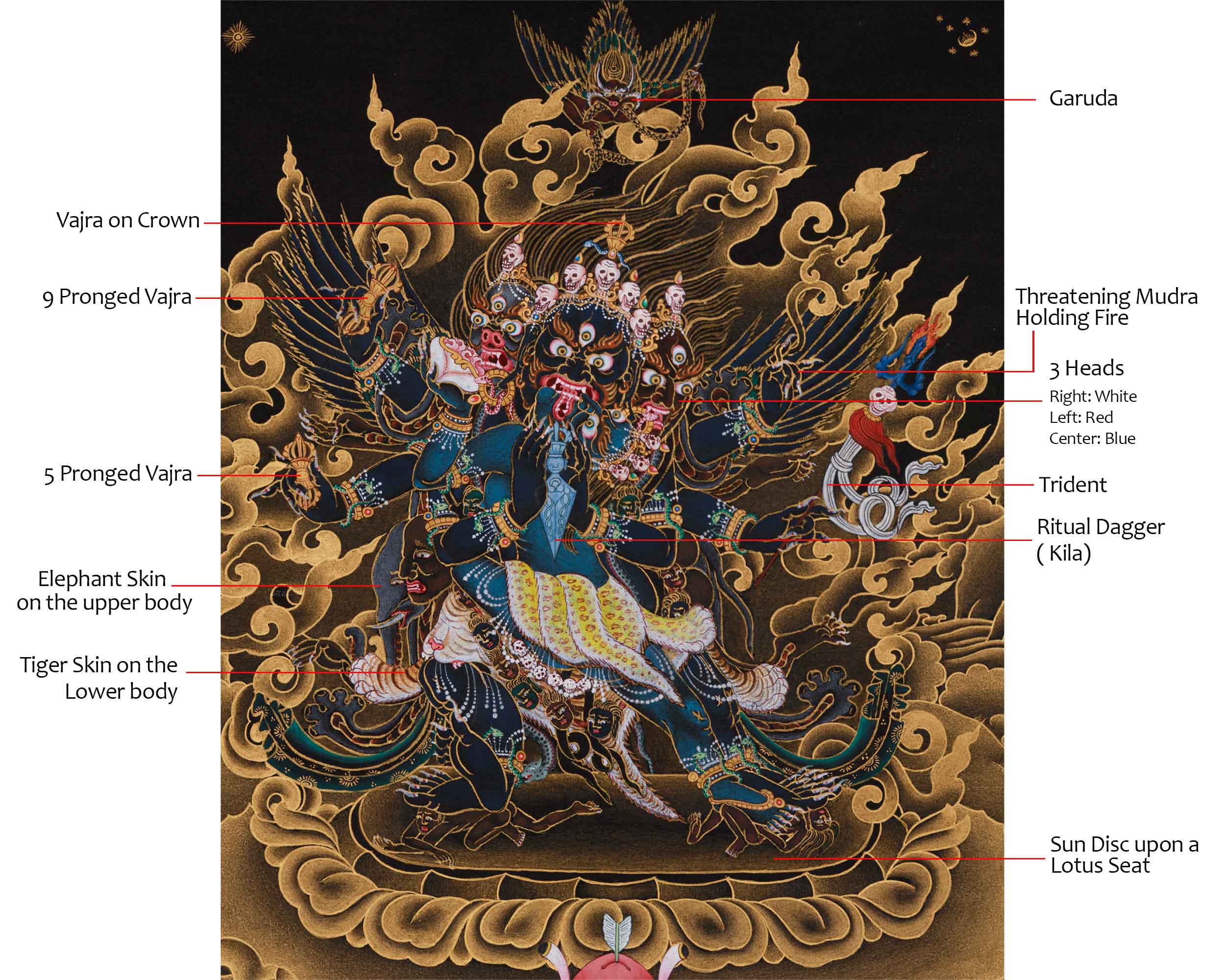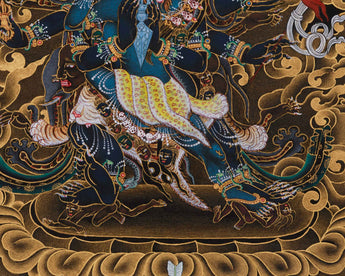 Vajrakilaya is a wrathful deity in Vajrayana Buddhism, known for clearing obstacles, destroying negative energies, and aiding spiritual growth. As a manifestation of the Vajra's power, he embodies destruction and transformation, helping practitioners eliminate barriers to enlightenment. He is a protector invoked in rituals to purge harmful forces and bring clarity. His wrathful appearance symbolizes the strength needed to overcome ignorance and defilements. This thangka shows Vajrakilaya in a fierce stance with three heads—white for wisdom, red for compassion, and blue for strength. His many arms hold weapons like a trident, a Kila dagger, and a Vajra to transform negativity. He wears elephant and tiger skins, symbolizing his protective power. The black background and gold details emphasize his wrathful energy, serving as a reminder of the strength needed for transformation.