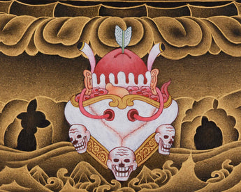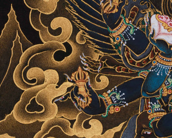 The Wrathful Vajrakilaya Thangka is a powerful, visually striking piece, hand-painted with intricate acrylic colors and finished with pure 24K gold. The thangka is painted in the traditional Nakthang (gold-on-black) style, where gold and black create a dramatic contrast that highlights the fierce and transformative energy of Vajrakilaya. The rich combination of materials and meticulous craftsmanship ensures this thangka captures not only the visual intensity but also the spiritual potency of Vajrakilaya’s presence.