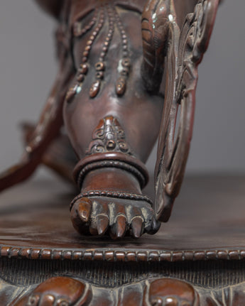 We meticulously hand-carved Wrathful Vajrapani Copper Sculpture using a traditional Himalayan sculpting method. Standing atop a sun disc, the deity is shown with a wrathful expression. In his right hand, he holds a vajra, and in his left, a whip. An oxidized copper body is used to mold the body. It took us months of hard work to mold and crave such details. Practitioners can use this statue for a variety of purposes, including Buddhist rituals and daily practices such as yoga and meditation.