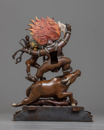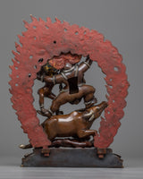 Our Yama with Consort Statue, a sculpture measuring 10.6 inches tall, depicts one of Tibetan Buddhism's most active deities. This monument represents the ultimate triumph over death and delusion and is ideal for practitioners and followers of Vajrayana teachings.