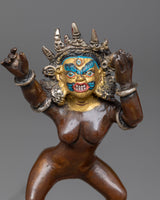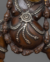 The body of this statue is beautifully fashioned from oxidized copper, giving it a rich, antique-like aspect. Yama Dharmaraja and his consort's meticulous features are highlighted by the silver plating, highlighting their fierce yet protective forms. The combination of gold and acrylic paints gives brightness and depth, emphasizing their unity as a symbol of the merger of wisdom and method.