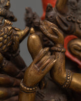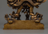 The antique finish on the gold lends a timeless feel to the statue, emphasizing the delicate details of Yamantaka's terrifying expressions and the panoply of spiritual weapons he carries. Each piece is intended to symbolize Yamantaka's dynamic function as a protector, as well as his fierce will to overcome bad forces.