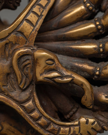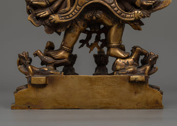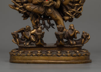 Discover the rich symbolism of the yamantaka-antique-touch statue, a striking portrayal standing 28.5 cm tall. This statue, made of copper and gilded in 24K gold, has an antique appearance that highlights its precise engravings and powerful iconography. Weighing 4.04 kg, its commanding presence draws attention and veneration, making it a focal point in any situation.