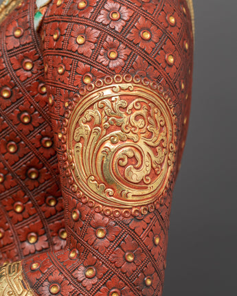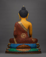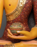 This statue's superb construction from a copper body and 24K gold gilding perfectly complement the vivid acrylic paintings in gold and yellow that accentuate the Buddha's contented countenance and the dexterous detailing of his robes. With its massive presence and weight of 24.81 kg, it is perfect for enlarging the sacred area of larger meditation centers or temples, or for use as the focal point of large home sanctuaries, This Shakyamuni Buddha Statue in yellow should be displayed prominently to promote peace and spiritual awakening.