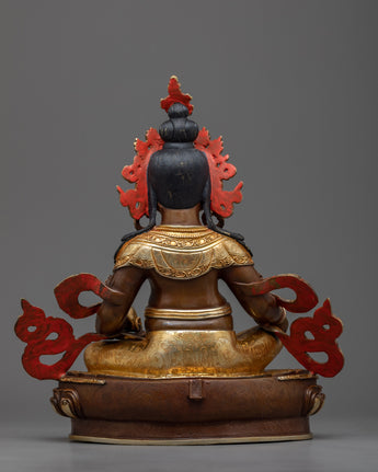 Discover Dzambala's enchantment, brilliantly depicted in this finely carved statue. Every contour and detail comes to life, encapsulating the rich symbolism and essence of Dzambala, the wealth and prosperity deity. The oxidized copper body's deep tones are offset by the glitter of 24K gold plating, and beautifully placed gold and acrylic paintings provide depth and vitality to the piece.