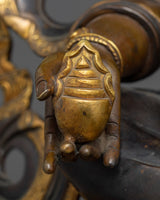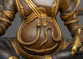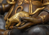 The statue, which was handcrafted with painstaking attention to detail, incorporates an immaculate blend of 24k gold gilding and brilliant acrylic paintings that bring Dzambhala to life in a palette of rich, golden hues. The oxidized copper body provides depth and timeless beauty, testifying to years of tradition and expertise.