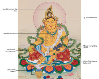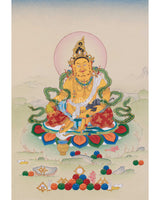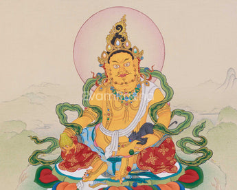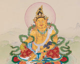 In this thangka, Yellow Jambhala is seated on a lotus throne, with a luminous golden aura symbolizing the infinite blessings of wealth. His left hand holds a mongoose spitting jewels, representing the flow of abundance, and his right hand holds a citron fruit. Detailed gold robes and a crown, along with vibrant pigments, enhance its sacred energy. Every detail is meticulously hand-painted to reflect devotion and spiritual intent. Bring this artwork into your home or sacred space to invite prosperity, protection, and divine abundance.