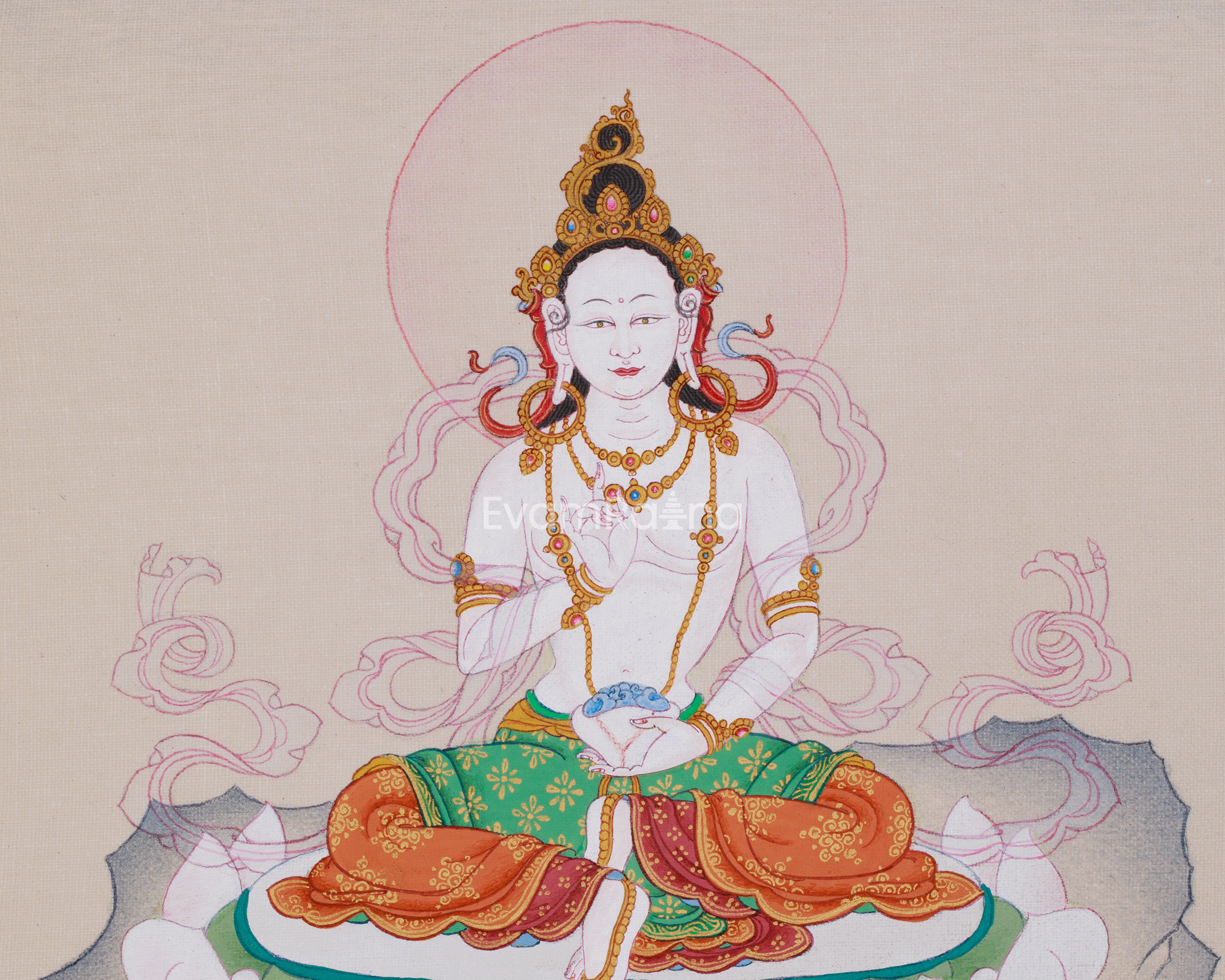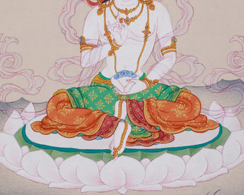 This thangka depicts Yeshe Tsogyal, renowned as the "Mother of Tibetan Buddhism," with grace and strength. She is shown sitting on a lotus throne, representing her enlightened essence, draped in flowing robes with intricate golden patterns. In her hand, she carries a skull cup filled with nectar or wisdom, signifying her role in sharing sacred teachings. This thangka is perfect for practitioners, collectors, and anyone looking to invite the blessings of wisdom and compassion into their space.