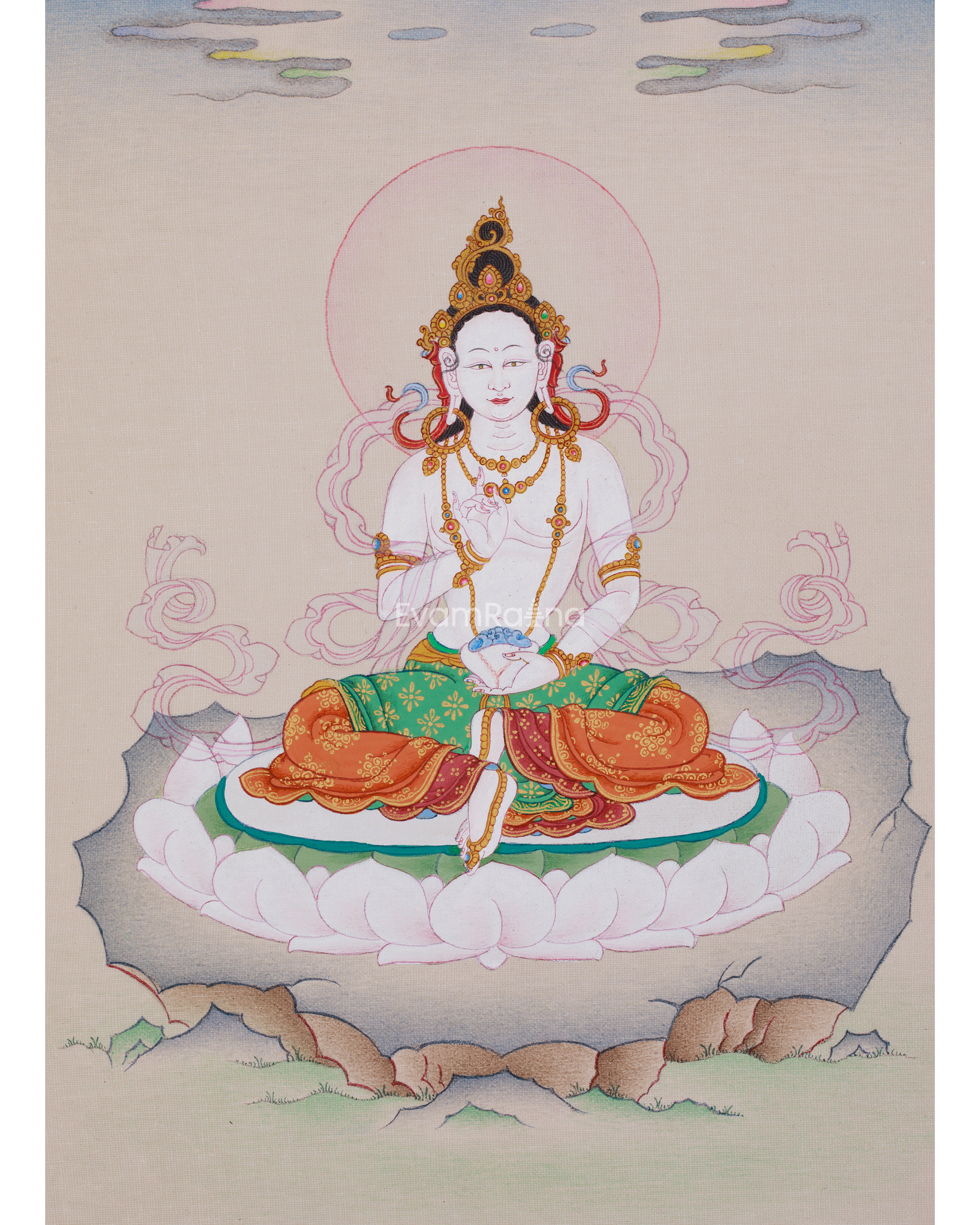 The Yeshe Tsogyal artwork features a divine presence, created on cotton canvas with natural stone colors and 24K gold. Made in the traditional Karma Gadri style, it showcases intricate detailing along with a peaceful yet commanding composition, symbolizing her wisdom and compassion. The use of natural stone colors combined with gold accentuates her luminous beauty, rendering this thangka a timeless piece of spiritual artistry.