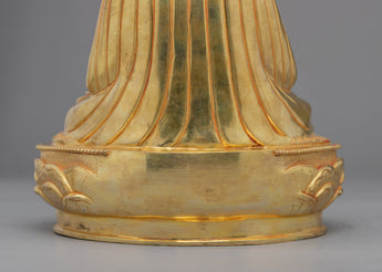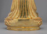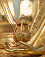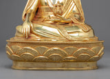 The Zhabdrung Rinpoche Sculpture was expertly carved in our studio in Nepal by the master craftsmen of Nepal. The figure was carved using a copper body, gilded with 24k genuine gold and finely painted with acrylic paint. The deity is depicted seated upon moon disc lotus in a meditative posture as he holds a vase with his left hand and make the earth touching mudra with his right hand. The deity wears a flawlessly carved lama hat and is highlighted by the white beard that is flawless done on the statue. The statue can be used for various Buddhist rituals as your everyday meditational practices.
